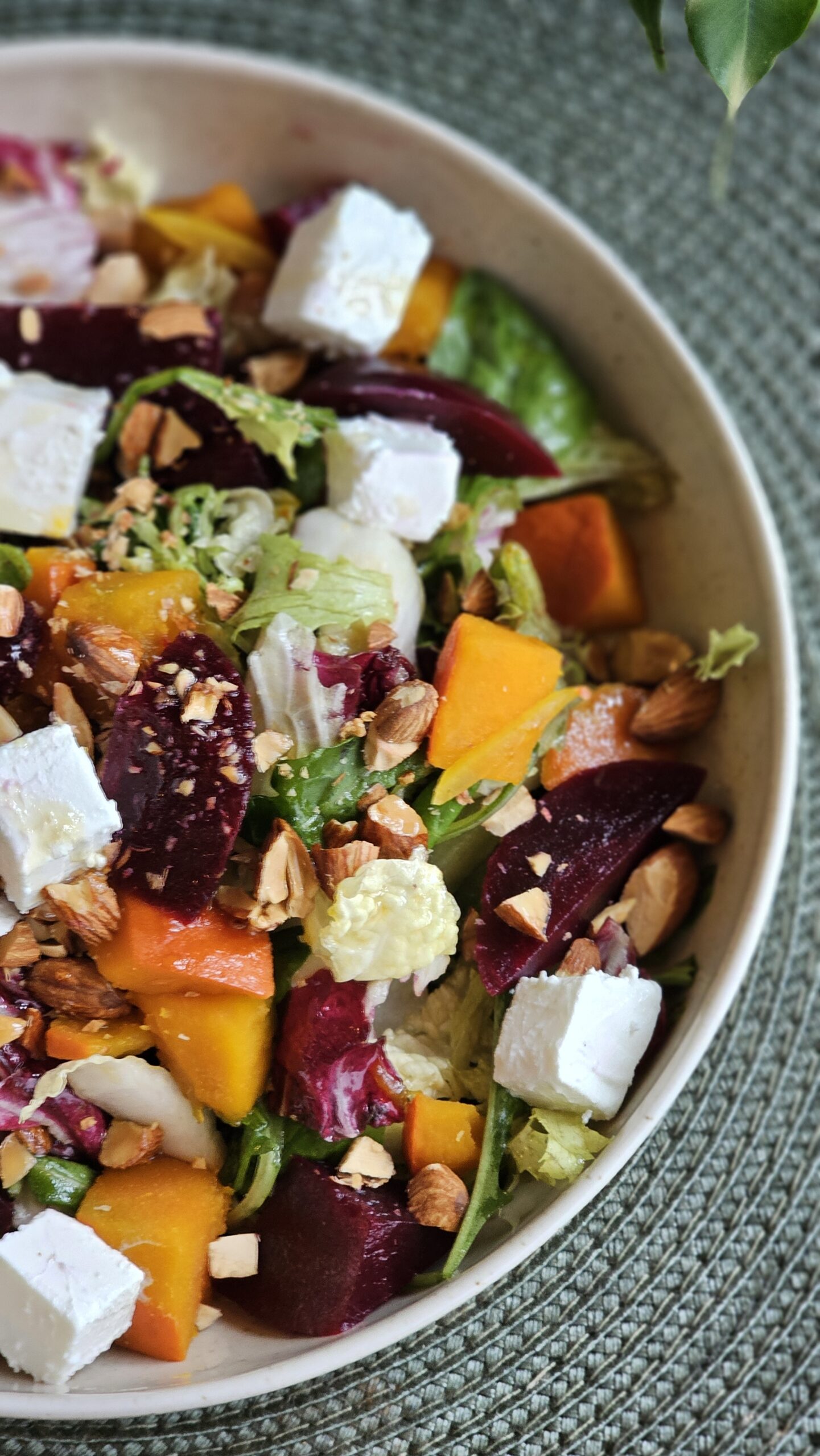 ar Fetas sieru, vārītām bietēm, riekstiem un medus-citrusu mērci