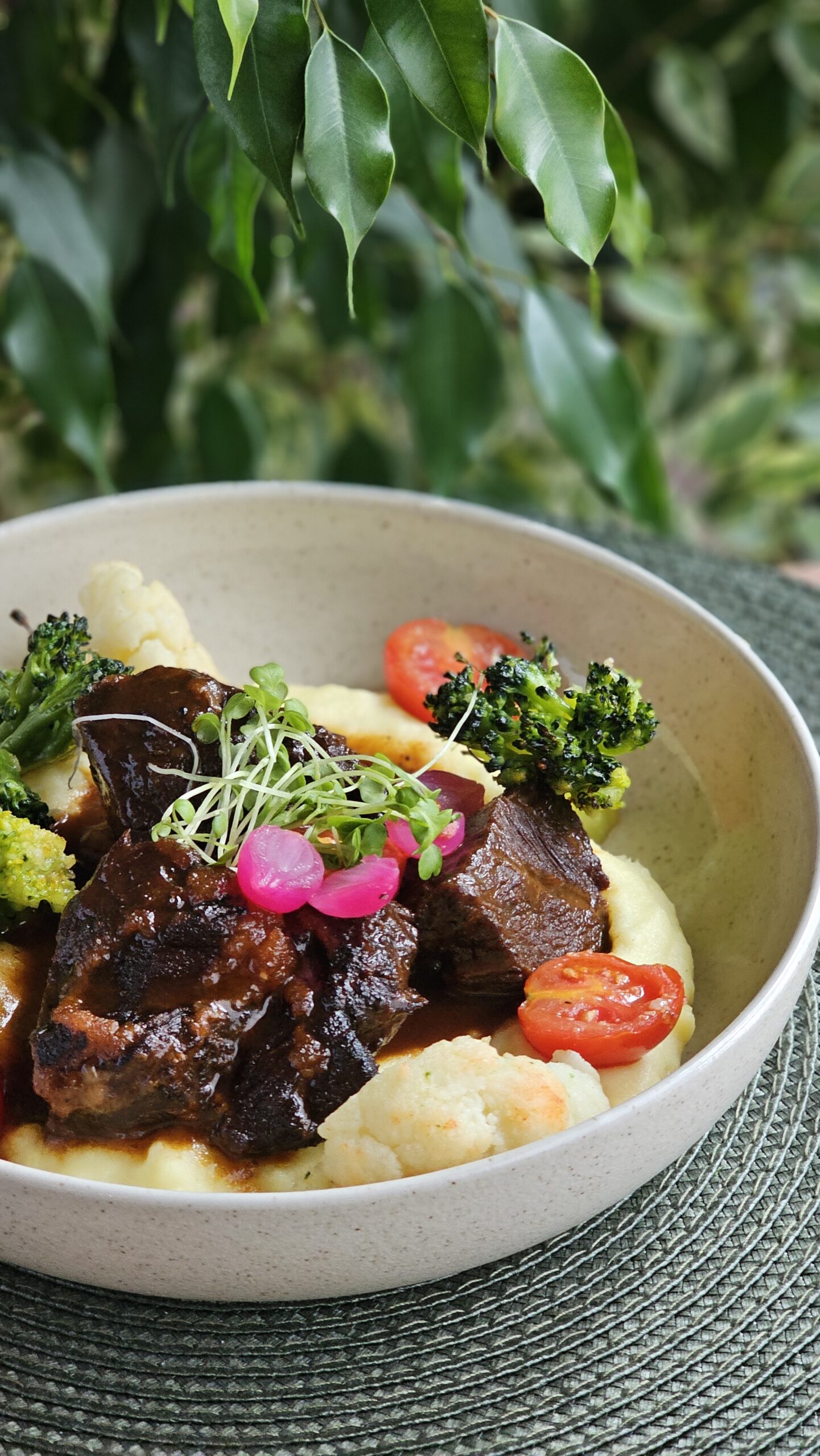 ar kartupeļu biezeni, sarkanvīna demi glaze mērci un apceptiem dārzeņiem