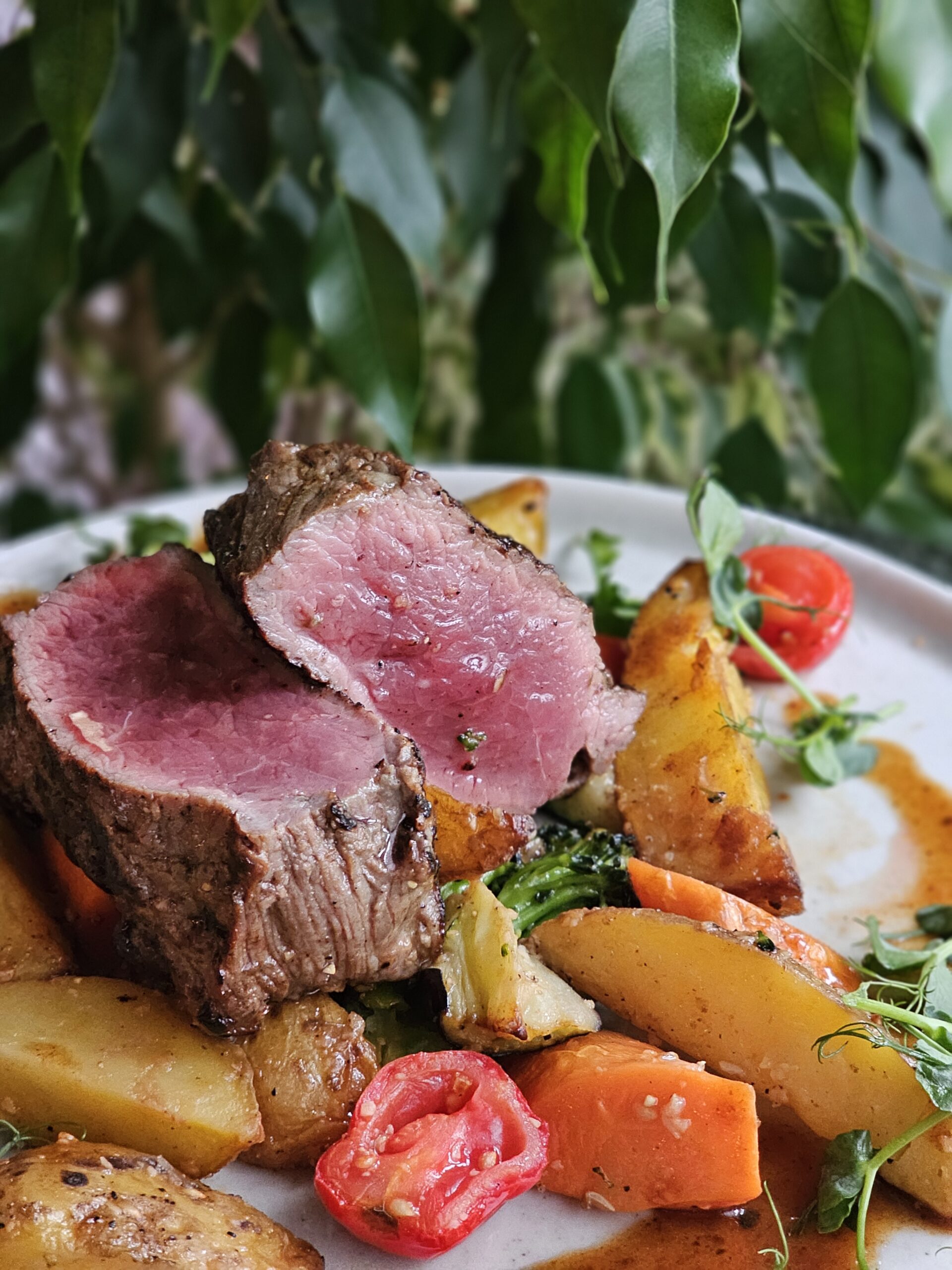 ar krāsnī ceptiem kartupeļiem, sarkanvīna demi glaze mērci un apceptiem dārzeņiem